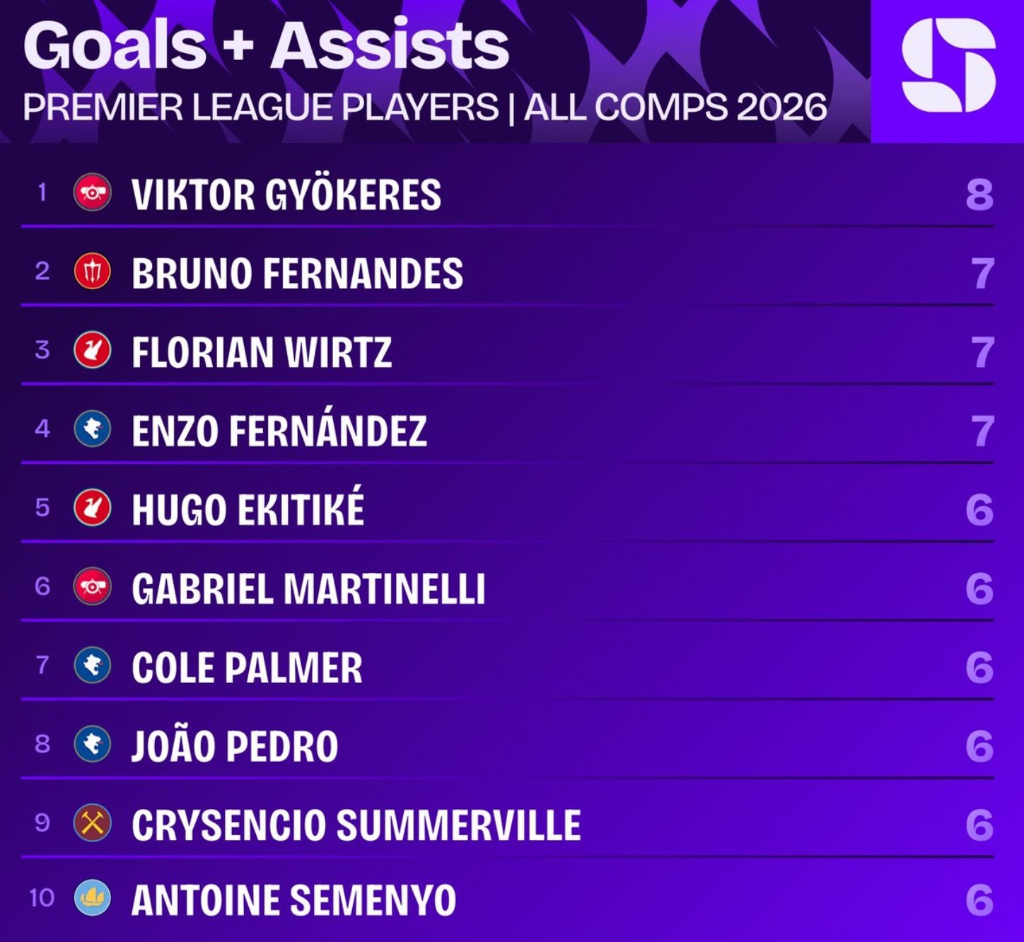 哲凱2026年各項(xiàng)賽事已直接參與8球,同期英超球員中最多