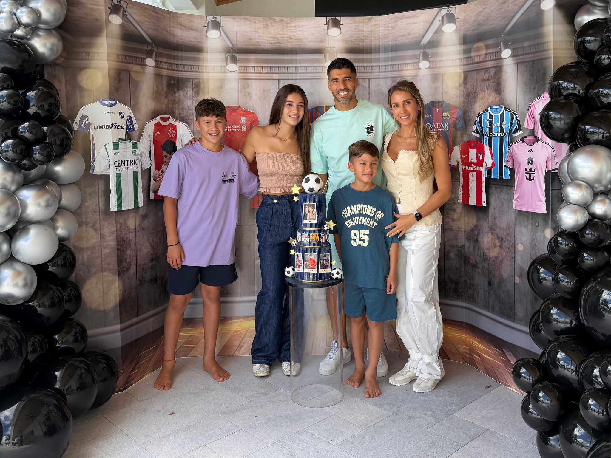 蘇亞雷斯與家人一同慶祝39歲生日,背景為效力過(guò)球隊(duì)的球衣