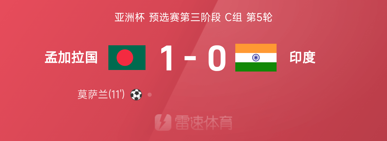 雷速體育11月18日訊 27賽季亞洲杯預(yù)選賽第三階段C組第5輪,孟加拉國(guó)1-0戰(zhàn)勝印度。