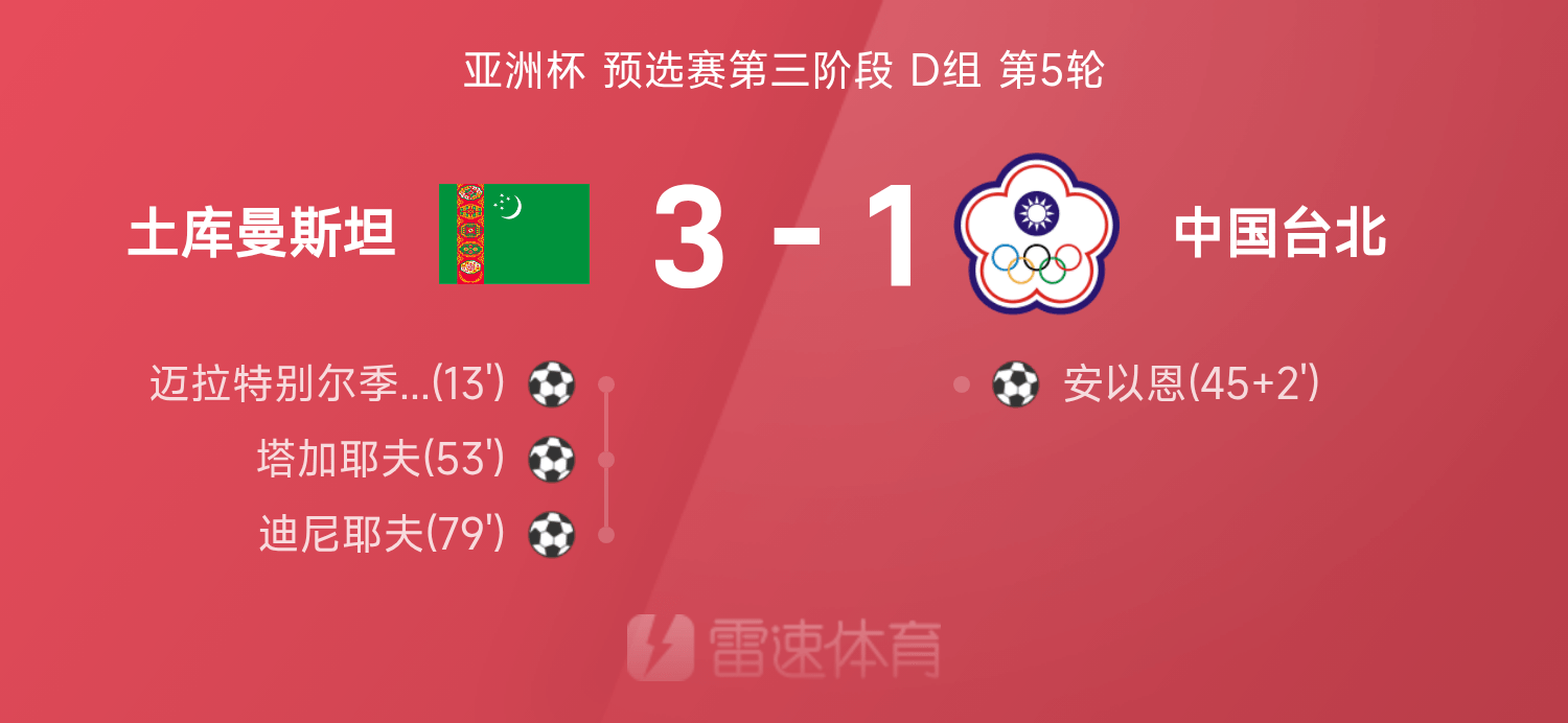 雷速體育11月18日訊 27賽季亞洲杯預(yù)選賽第三階段D組第5輪,土庫(kù)曼斯坦3-1戰(zhàn)勝中國(guó)臺(tái)北。