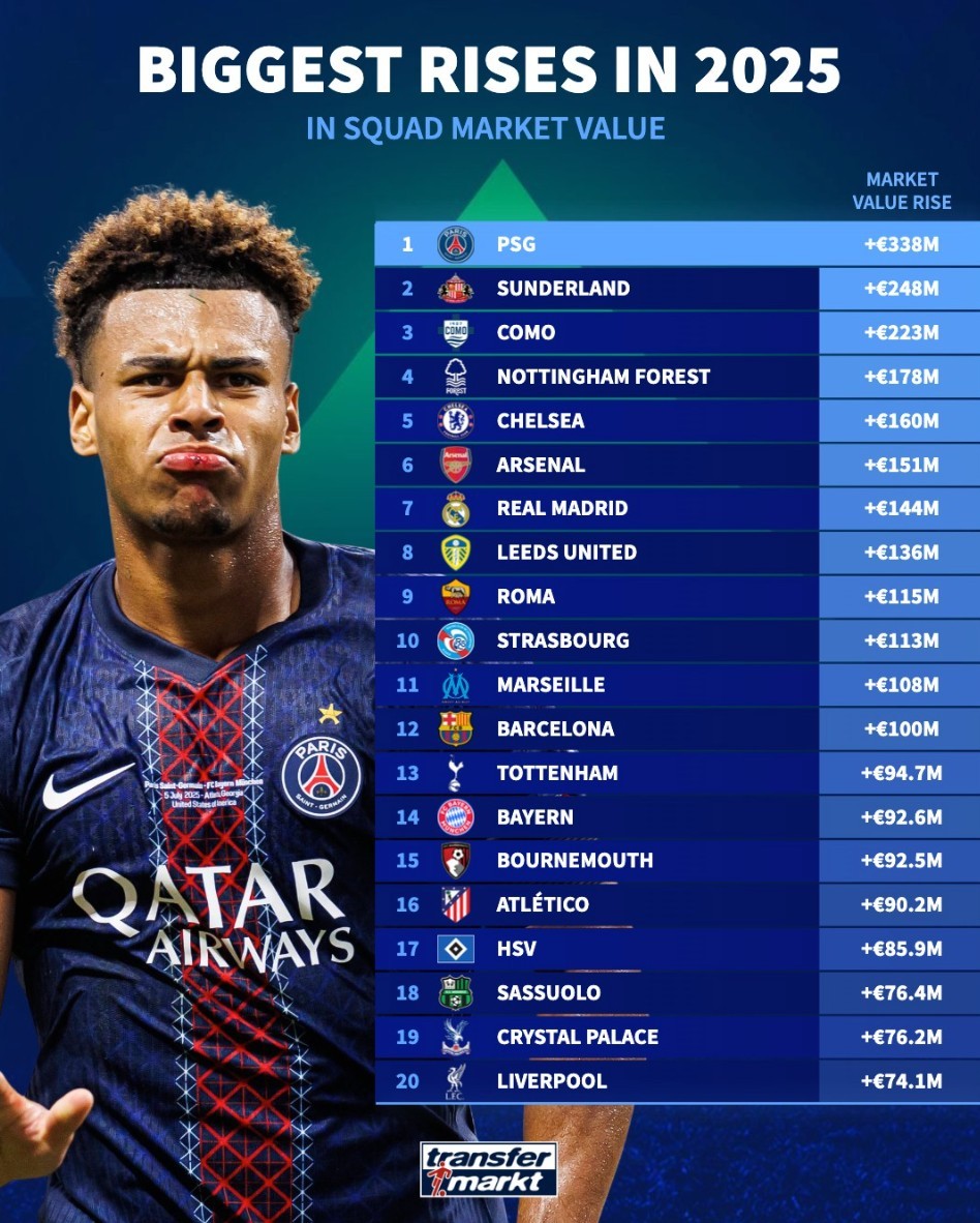 2025俱樂部身價漲幅榜:巴黎+3.38億領跑,車槍皇分列5到7位