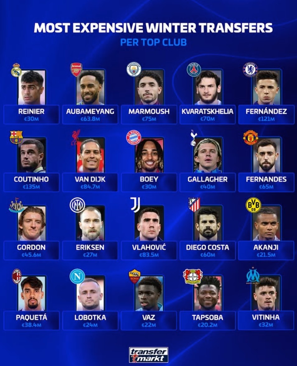 北京時間1月19日,德轉(zhuǎn)列出了歐洲五大聯(lián)賽20大俱樂部各自隊史的冬窗最貴引援,巴塞羅那1.35億歐元