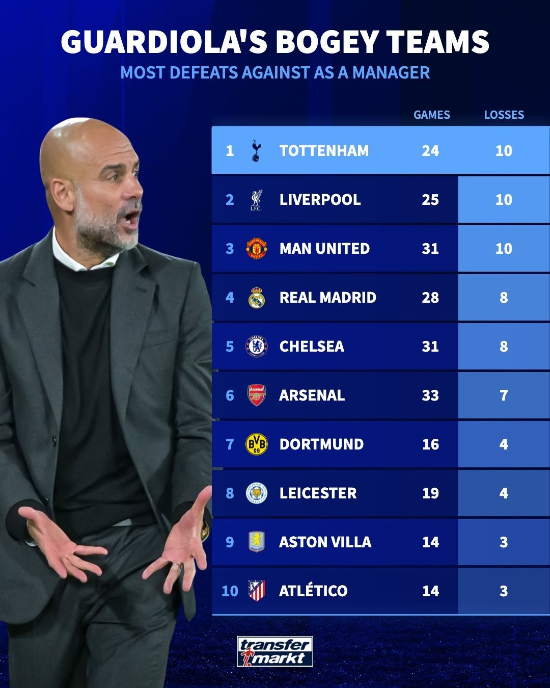 24戰(zhàn)10負(fù),熱刺是瓜迪奧拉教練生涯至今輸球場次最多的對手