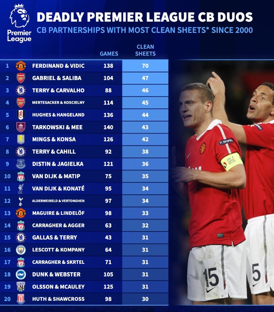 北京時(shí)間1月20日,德轉(zhuǎn)列出了自2000年以來英超首發(fā)中衛(wèi)搭檔零封次數(shù)榜,曼聯(lián)的里奧-費(fèi)迪南迪和維迪