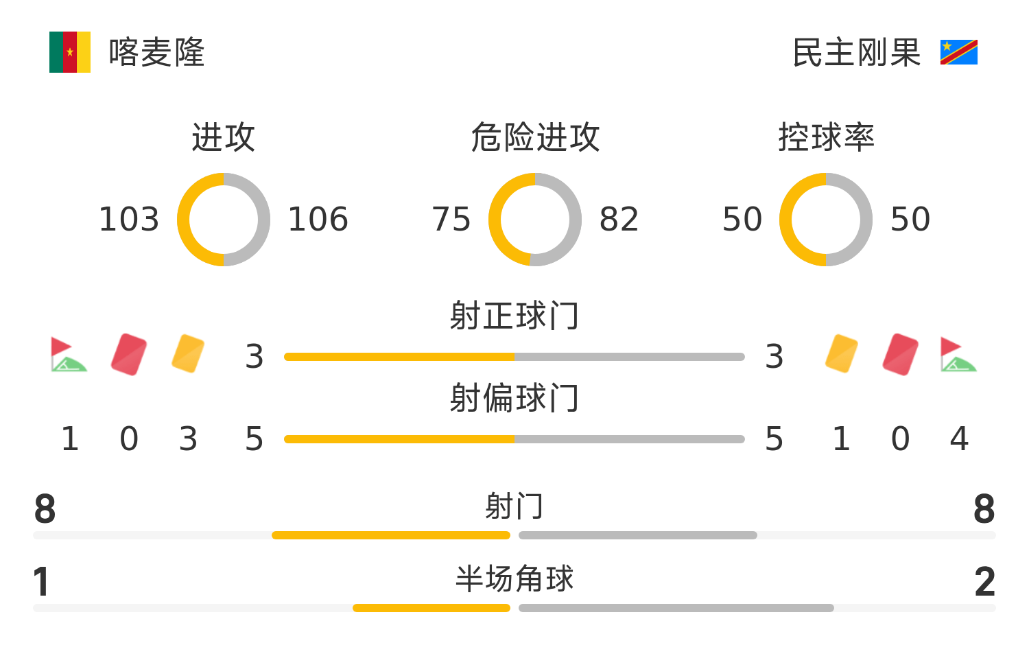 民主剛果首發(fā)陣容:1-姆帕斯、22-姆本巴、12-卡延貝、4-圖安澤貝、2-萬(wàn)-比薩卡、18-皮克爾(59’5-卡亞比)、8-穆圖薩米、11-薩迪基(89’6-穆考)、17-巴坎布(75’19-梅耶爾)、10-博格納達(dá)、7-姆布庫(kù)(75’20-齊本加)