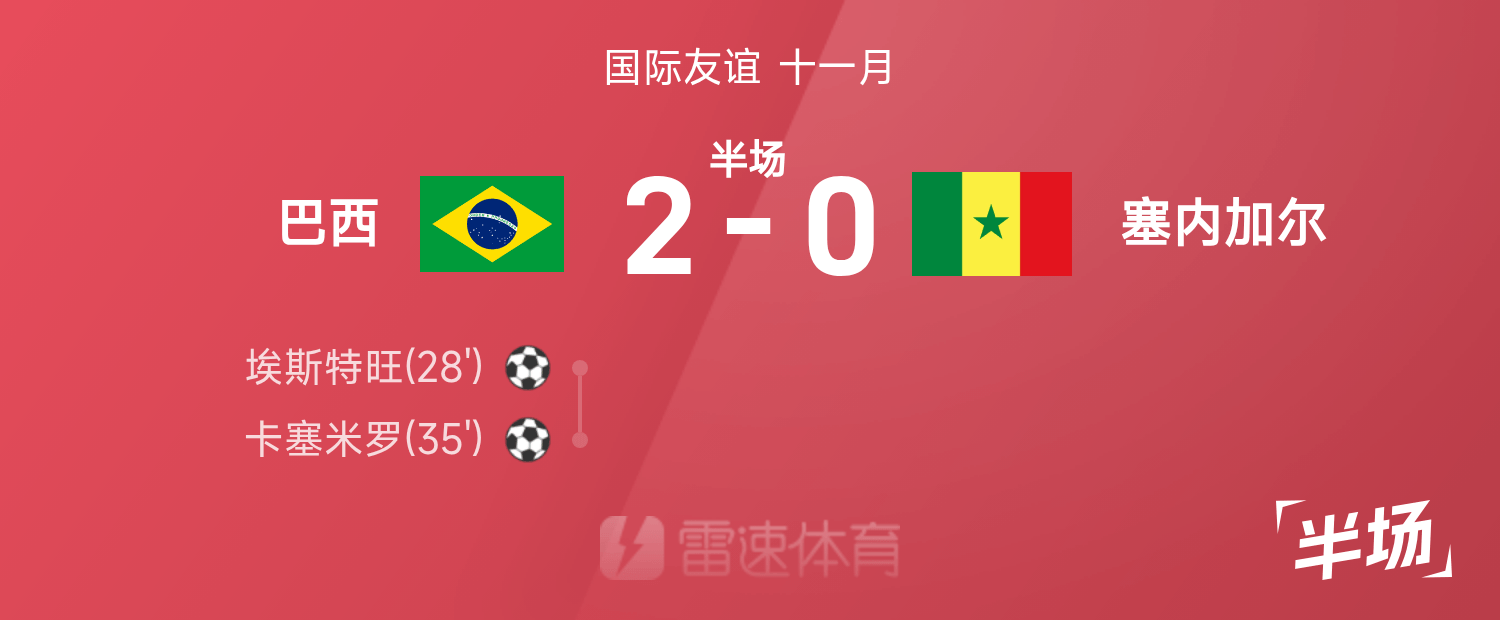 雷速體育11月16日訊 25賽季國(guó)際友誼十一月,巴西迎戰(zhàn)塞內(nèi)加爾。半場(chǎng)戰(zhàn)罷,雙方比分暫為巴西2-0塞內(nèi)加爾,埃斯特旺、卡塞米羅破門建功。