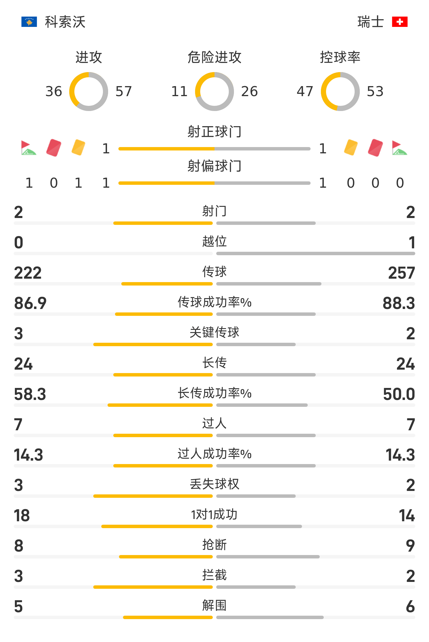 瑞士首發(fā)陣容:1-科貝爾、13-羅德里格斯、3-威德默、4-埃爾維迪、5-阿坎吉、10-扎卡、15-索烏、20-阿比切爾、7-恩博洛、17-巴爾加斯、9-曼贊比