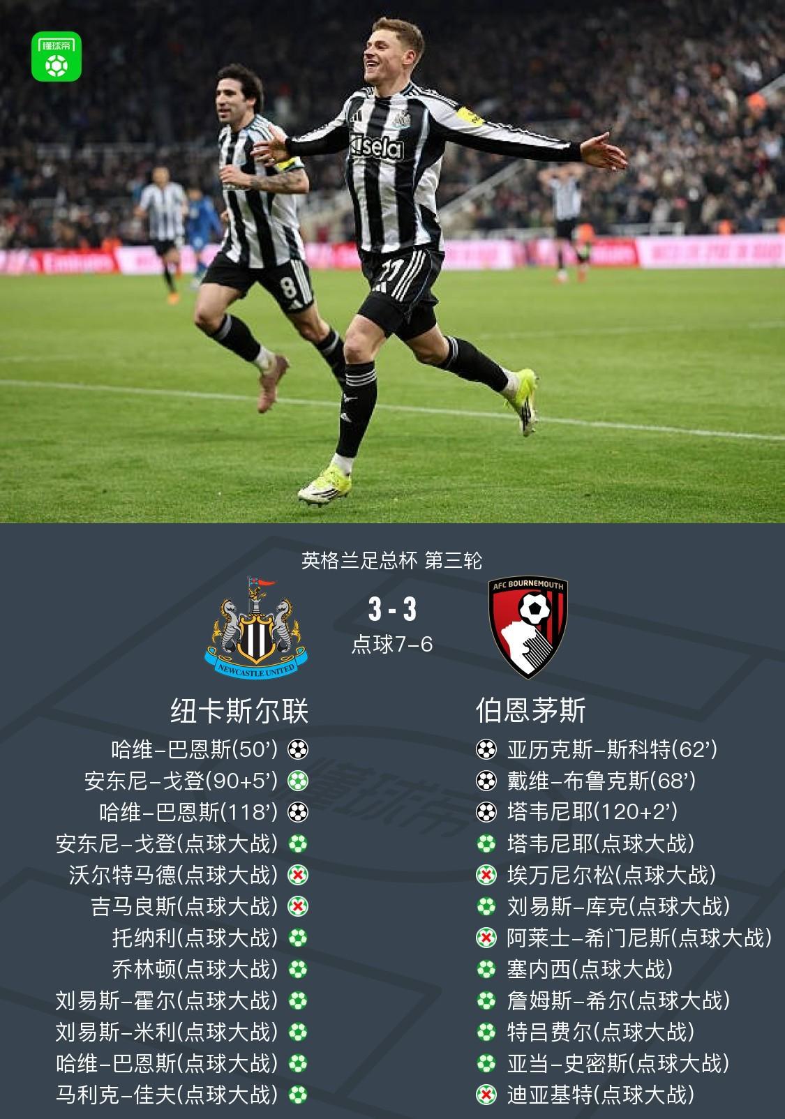 第118分鐘,拒絕點(diǎn)球大戰(zhàn)?巴恩斯頭球破門,紐卡3-2伯恩茅斯