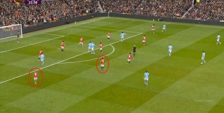 反擊的起跑線前,曼聯(lián)甚至無需額外自己制造空間,只需要姆貝烏莫和布魯諾不斷移動,在羅德里身側(cè)、中衛(wèi)身前的區(qū)域就有很大的機會接到球,緊接著就可以聯(lián)系到多爾古和阿瑪?shù)?迪亞洛所在的邊路,就可以帶著速度和沖擊力沖向曼城的門前。