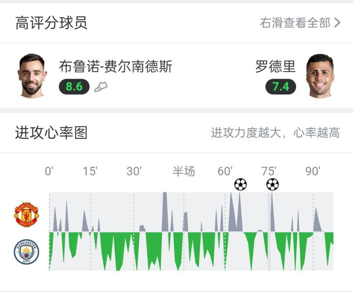 這個時候,你再來看曼聯(lián)和曼城在“進攻心率圖”上的表現(xiàn):