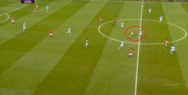 這些地方并沒有隊友給布魯諾制造出空間,大部分都源于曼城在逼搶時出現(xiàn)的脫節(jié),當然也和曼城的逼搶效率不足有關(guān),畢竟這是曼城在新年后的第六場比賽,只是曼聯(lián)的第四場。