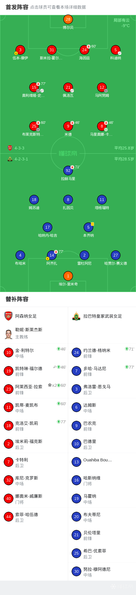第21分鐘,雷杜阿尼手球送點(diǎn),馬里奧娜-卡爾登泰操刀命中,阿森納女足3-0!