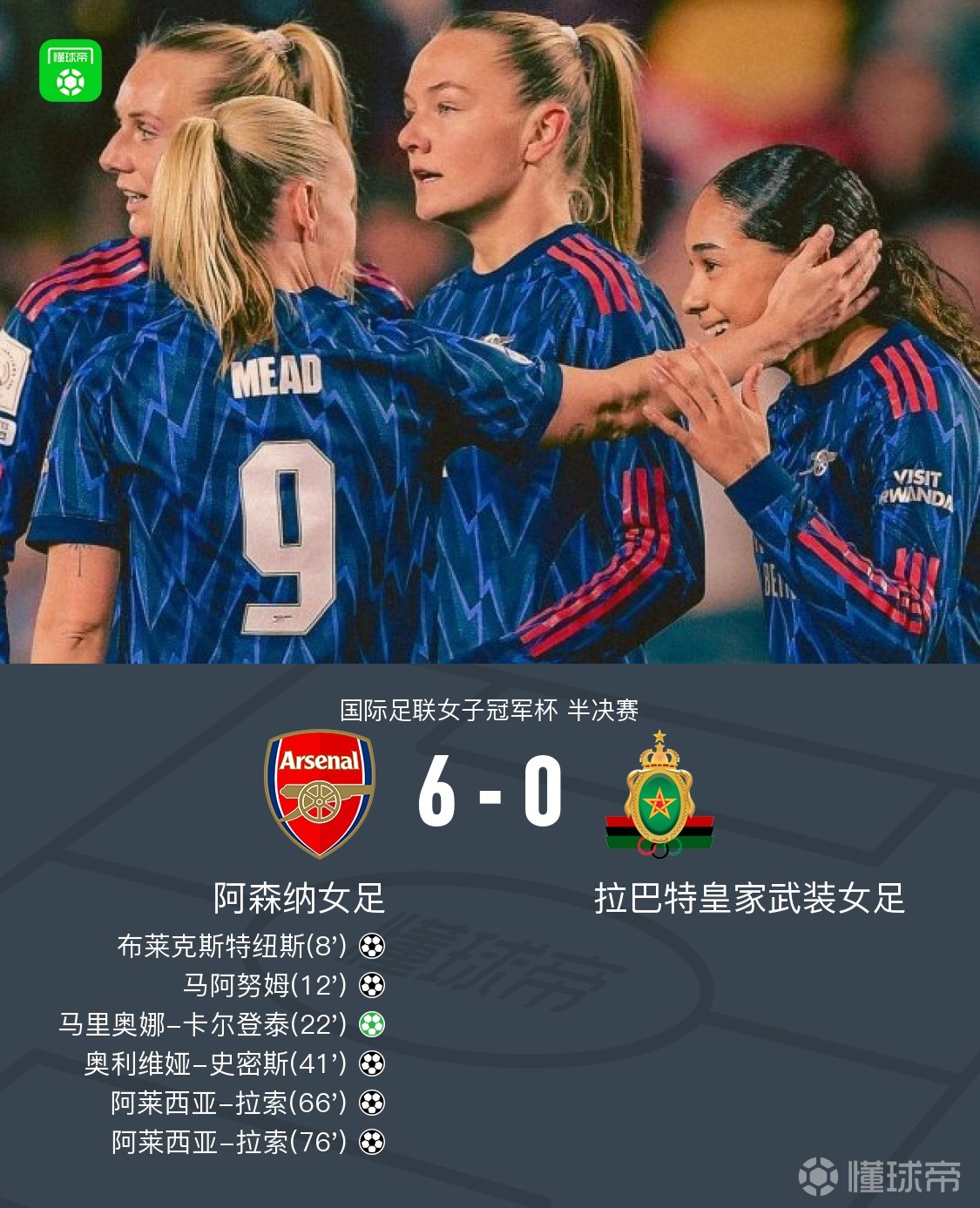北京時間1月29日,國際足聯(lián)女子冠軍杯半決賽,阿森納女足對陣?yán)吞鼗始椅溲b女足。比賽中,阿萊西亞-拉索梅開二度,布萊克斯特紐斯、馬阿努姆、馬里奧娜-卡爾登泰、奧利維婭-史密斯分別建功。最終,阿森納女足多點(diǎn)開花6-0大勝拉巴特皇家武裝女足,晉級FIFA女冠杯決賽。