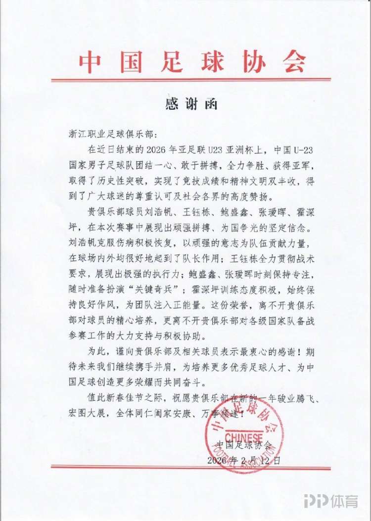 浙江FC收到中國足協(xié)發(fā)來的感謝函,中國足協(xié)就劉浩帆、王鈺棟、鮑盛鑫、張璦暉、霍深坪在2026年亞足聯(lián)U23亞洲杯上的努力和貢獻,向浙江FC表達了感謝。
