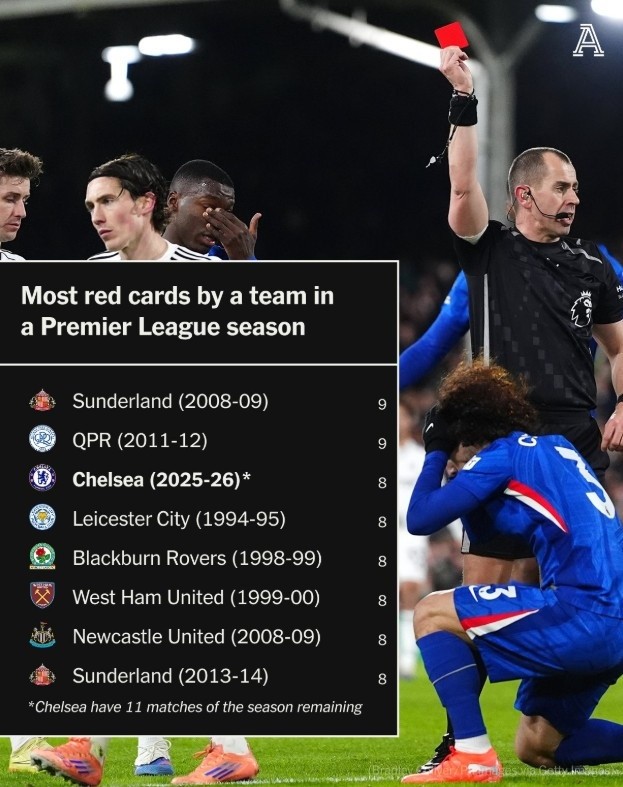 根據(jù)The Athletic統(tǒng)計(jì),切爾西本賽季英超已經(jīng)吃到8張紅牌,在英超球隊(duì)單賽季紅牌榜上排名第三。