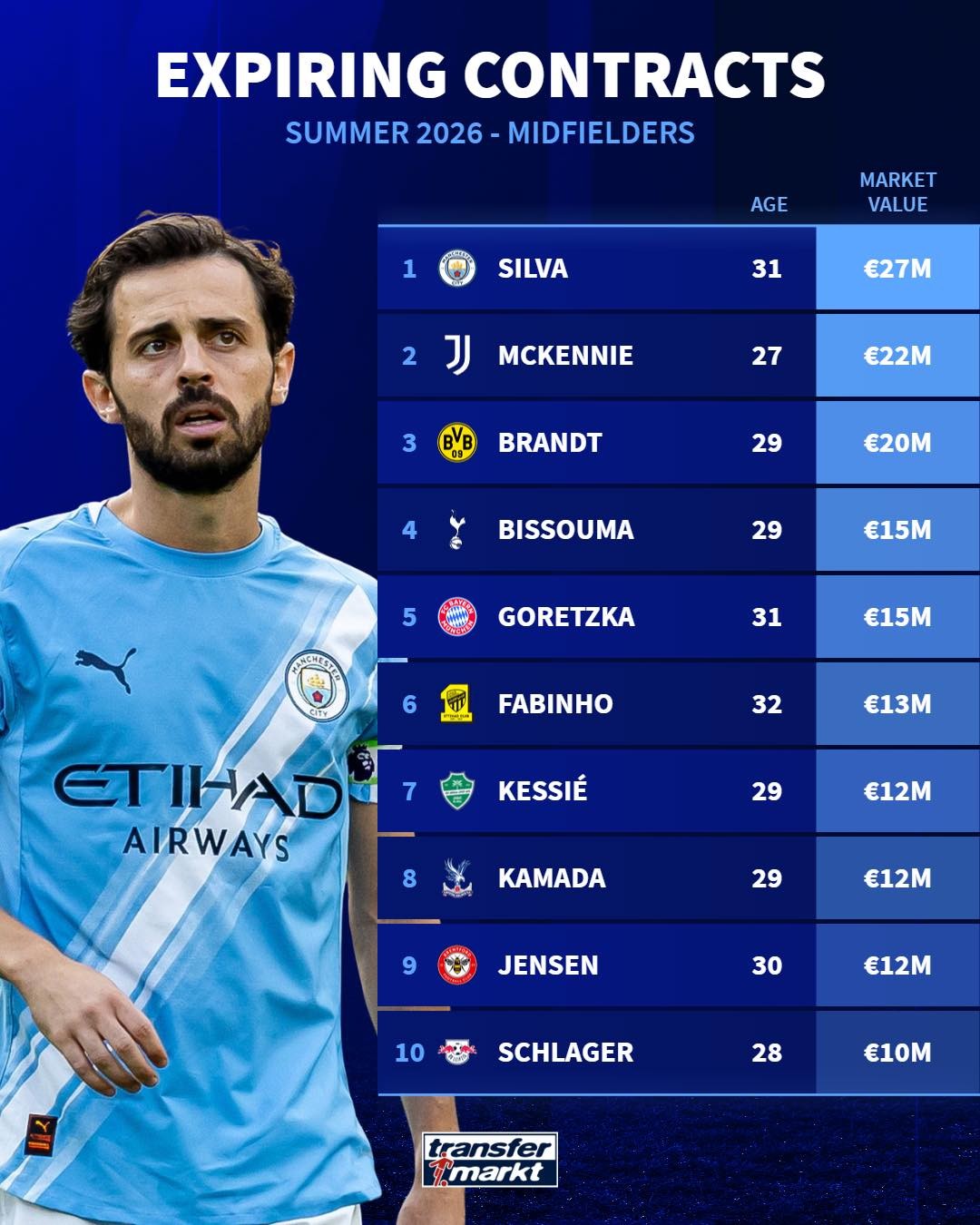 德國轉(zhuǎn)會市場統(tǒng)計(jì)了今夏合同到期的十大中場,其中球員按照身價(jià)從高到低排序。
