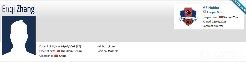 張恩祈現(xiàn)年17歲,司職中場,此前效力于中冠五華華京。